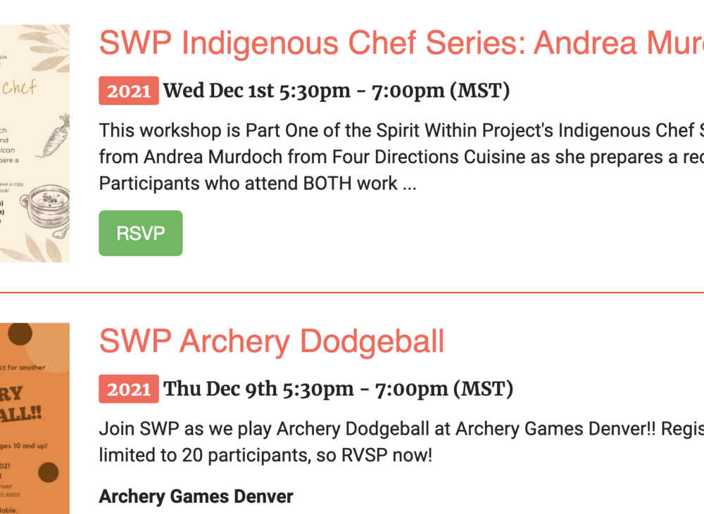 SWP Indigenous Chef Series: Andrea Murdoch 2021 Wed Dec 1st 5:30pm – 7:00pm (MST) This workshop is Part One of the Spirit Within Project’s Indigenous Chef Series. Learn from Andrea Murdoch from Four Directions Cuisine as she prepares a recipe to live! Participants who attend BOTH workshops will receive a copy of “The Sioux Chef’s Indigenous Kitchen” cookbook! […]