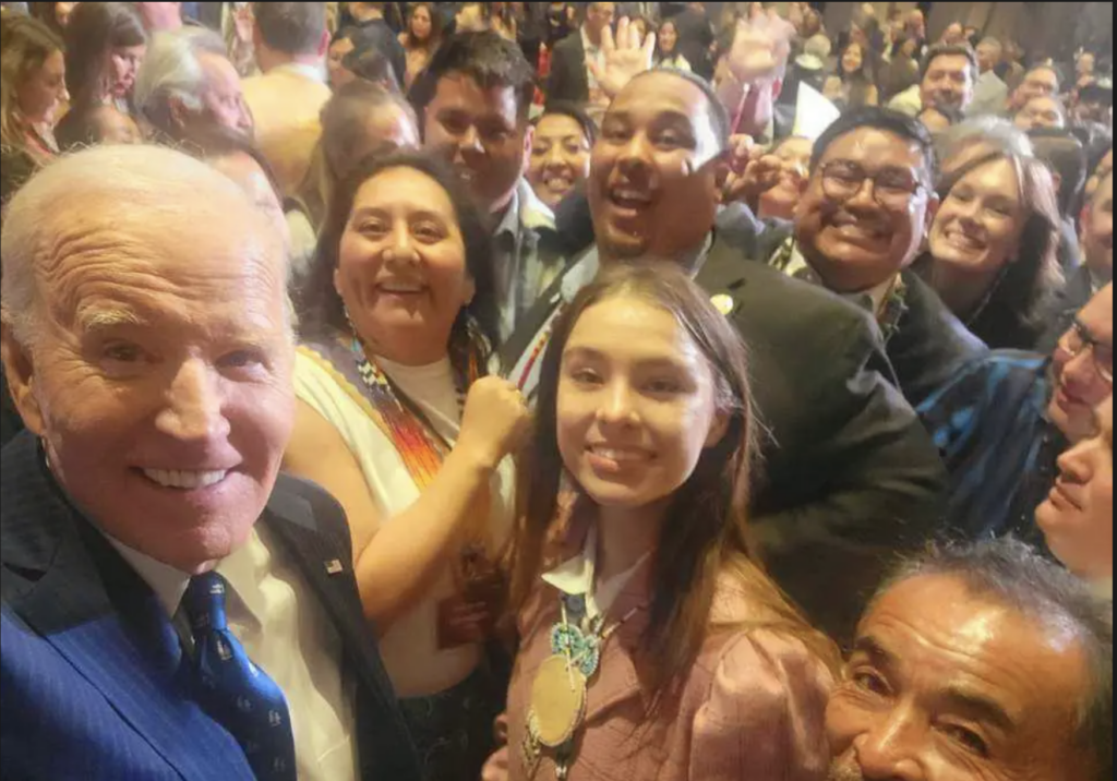 Kiara’s leadership extended beyond virtual spaces when she represented UNITY and Native youth at the White House Tribal Nations Summit. “I and nine other Native youth leaders had the opportunity to meet Vice President Kamala Harris, share our stories with her, and hear her advice,” Kiara recalls with pride. The event brought together tribal leaders and federal officials to discuss critical issues affecting Native communities. Kiara’s voice and others amplified the importance of investing in Indigenous youth as agents of change. “We also got a selfie with President Joe Biden, briefly met Secretary of the Interior Deb Haaland, and connected with leaders from across Indian Country,” she adds, reflecting on the incredible sense of pride and hope the event instilled.