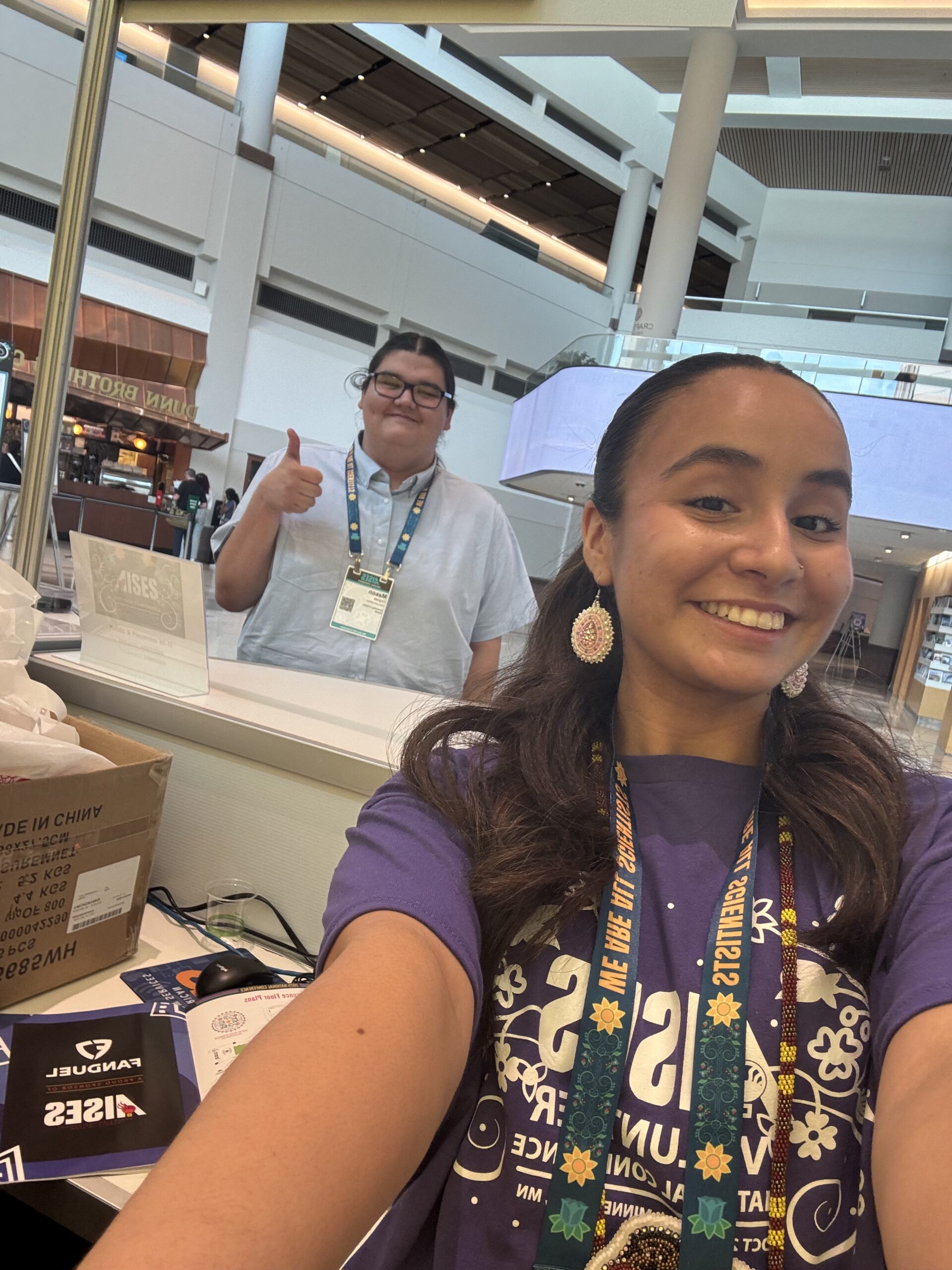 Boozhoo, my name is Marla Mesarina and I am a sophomore at the University of Minnesota Twin Cities. I attended the 2025 AISES Conference in Minneapolis, Minnesota. My experience during this conference was both exhilarating and fulfilling. I attended this conference with my AISES chapter at my University! I am not officially affiliated with the AISES chapter, as I am undecided of my major, but they welcomed me in to be a part of their group to attend the conference. I got to network with other natives in stem which was so awesome as I got to learn about their motives in life, as well as what steered them in the direction that they are going towards. It was very inspiring to see all these indigenous scholars pursuing such subjects, as science was never easy for me, but being surrounded by natives in stem gave me more confidence within myself. While at AISES, I also got to help assist with another organization that I am affiliated with which is the United National Indian Tribal Youth Organization (UNITY). I helped watch the booth and pitch UNITY to tribal leaders as well as community members. I love UNITY, so talking about the organization in a good way is easy for me. With my experience with UNITY, I got to reunite with a lot of friends during AISES. I visited with one of my very first friends I made at my first UNITY conference which was so awesome, as well as visiting other UNITY leaders. I also volunteered during the AISES conference working the registration booth. I enjoyed it as I got to meet people as I was registering them. During my volunteering session, I also took the opportunity to ask the AISES employees questions regarding their own career and how they came upon AISES. I love meeting new people and making connections, so volunteering was very fun. I am very grateful I was able to give back to this amazing organization in some way