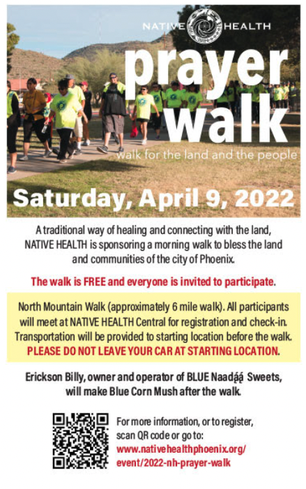 After two long years of missing their Annual Prayer Walk, Walk for the Land and the People, it’s back! Our Annual Walk will be held Saturday, April 9. This year we’ll have one walk, from North Mountain to NATIVE HEALTH Central.