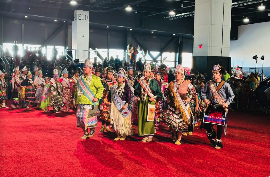 From there, Gabriel traveled to Wisconsin for the Lac Du Flambeau Big Drum Ceremonies, a seasonal celebration of song and unity within the Woodland Nations, followed by the Hunting Moon Powwow at the Baird Center in Milwaukee — one of the largest gatherings of Woodland singers and dancers. At each event, Gabriel strengthened cultural connections that transcend tribal lines, embodying the unity that lies at the heart of Native leadership.