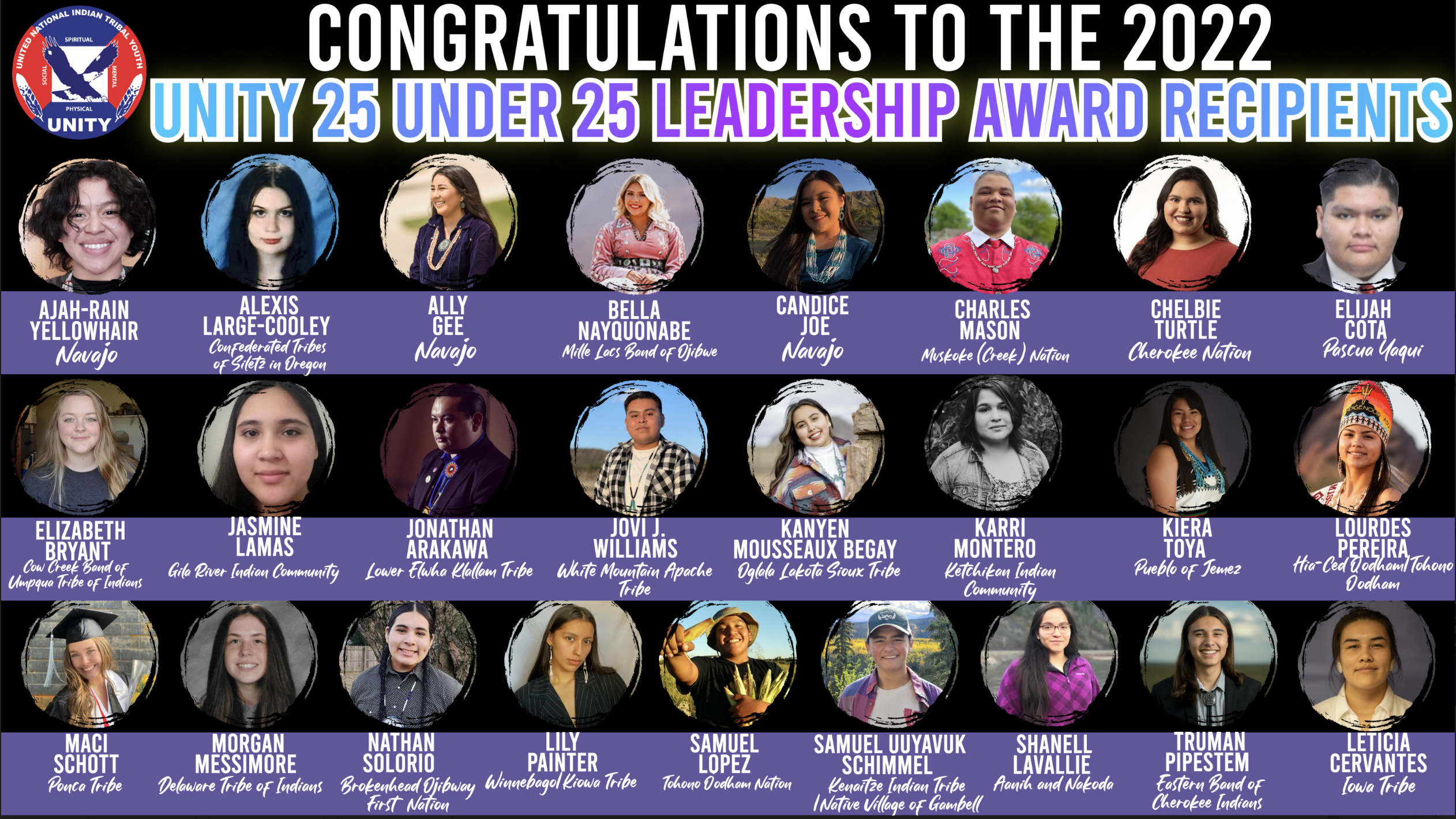 “Our Native youth have a passion for building and bettering their communities. UNITY’s 25 Under 25 program recognizes their achievements and encourages these young people to stay involved and further develop their leadership skills,” said Mary Kim Titla, UNITY executive director.