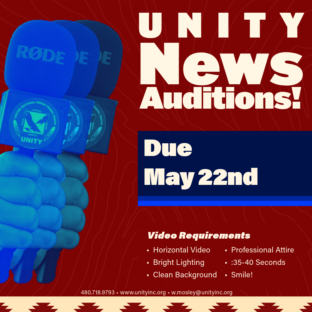 “Hi, I’m (your name) from the (tribe), thank you for tuning into UNITY news. The 2024 National UNITY Conference is just around the corner! Imagine 2,000 youth gathering in Portland, Oregon! The conference theme this year is Restoring Our Roots, which focuses on healing and overall wellness. This is your chance to network with other youth and develop your leadership skills. Get ready to experience some UNITY magic! It’s all happening June 29th through July 3rd. For more information, go to UNITY inc dot org. We look forward to seeing you in Portland!”