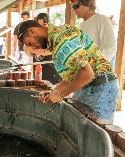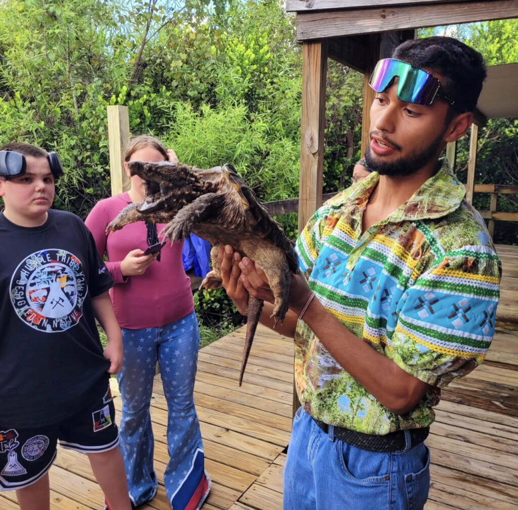 Throughout the day, the southeastern Native youth were also immersed in experiential learning. Billy Walker introduced them to a baby alligator, sparking a memorable lesson on respecting balance within the natural world and strengthening awareness of Florida’s fragile ecosystems. Complementing these teachings, Melanie Turtle delivered a traditional meal (Indian tacos, pumpkin fry-bread, and sofke corn drink) that demonstrated how foodways are more than nourishment—they are cultural practices of resilience and relationship with the land.