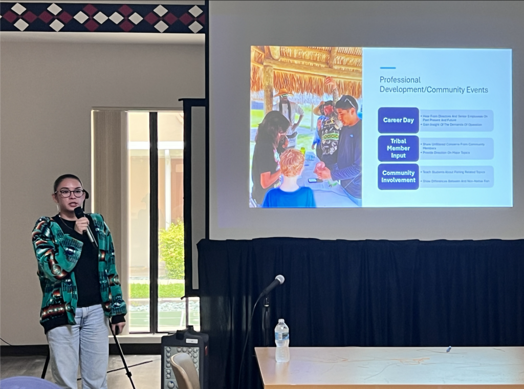 Presenters also addressed how policy and science safeguard tribal resources. JJ John, a Program Analyst in Environmental Compliance, provided practical insight into how regulations and monitoring protect tribal lands from environmental harm, while Carlise Bermudez from the Environmental Protection Office emphasized the importance of tribal-led enforcement and scientific approaches to ensure natural resources are managed responsibly. Together, their sessions bridged Indigenous knowledge with data collection and modern compliance frameworks, showing how both are necessary to defend tribal sovereignty and ecosystems.